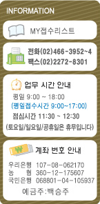 ¼¿ïƯº°½Ã Áß±¸ ÀåÃæ´Ü·Î8³ª±æ 11 | TEL (02) 466 - 3952 ~ 4 | FAX (02) 2272 - 8301